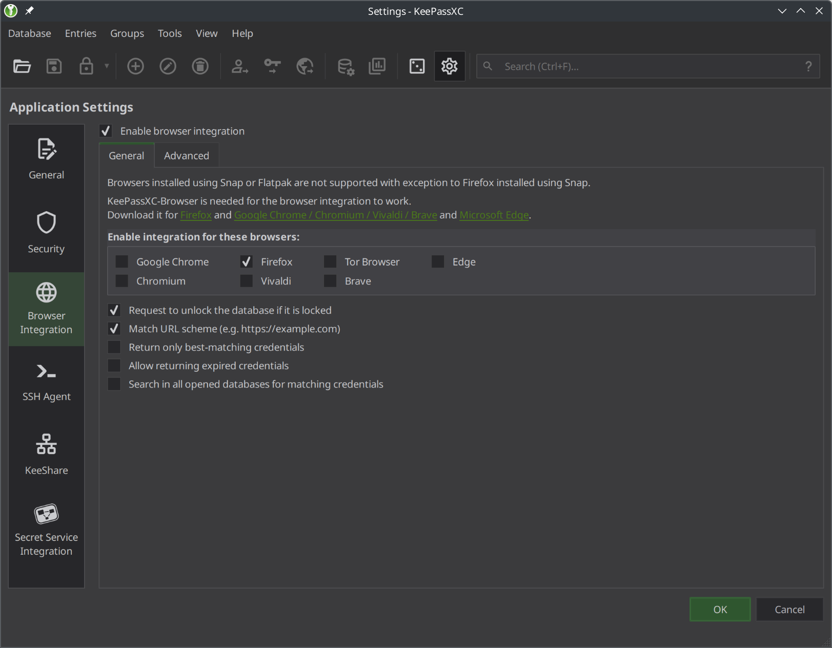 - Set up KeepassXC for browser integration with Firefox. From KeepassXC, select Tools → Settings → Browser Integration, then enable it for Firefox